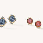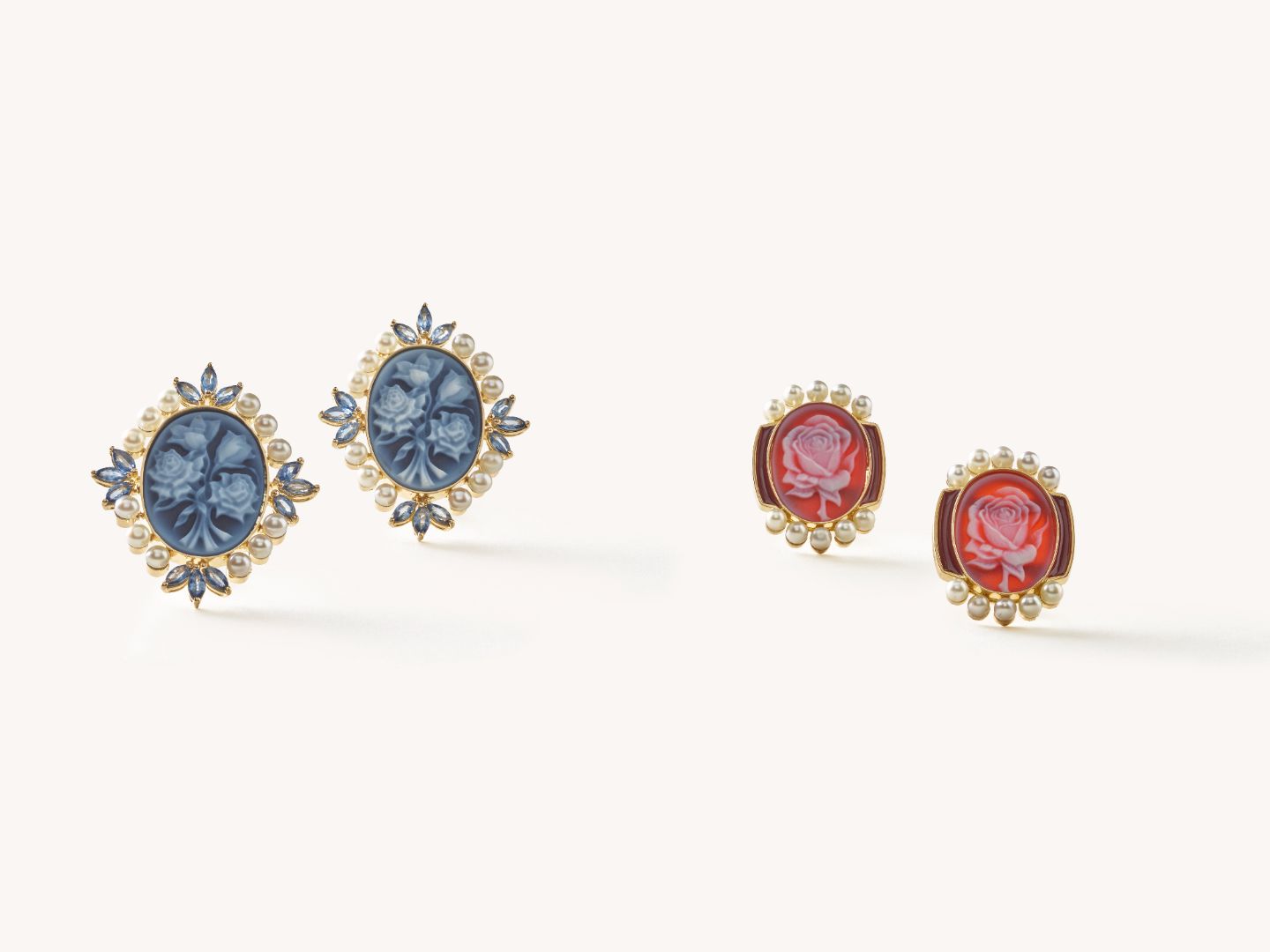 تتميز هذه الأقراط الجذابة بتصاميم زهرية منحوتة بدقة في مركز حجر الكاميو الأزرق والأحمر. ممسكة بذهب عيار 18 قيراط، كل حجر كاميو محاط بلآلئ جيوان، تعزز من جمال الزخارف الزهرية. تجعل الحرفية الماهرة ودمج الأحجار الكريمة باللؤلؤ الطبيعي هذه الأقراط عملاً فنياً يستحق التقدير.