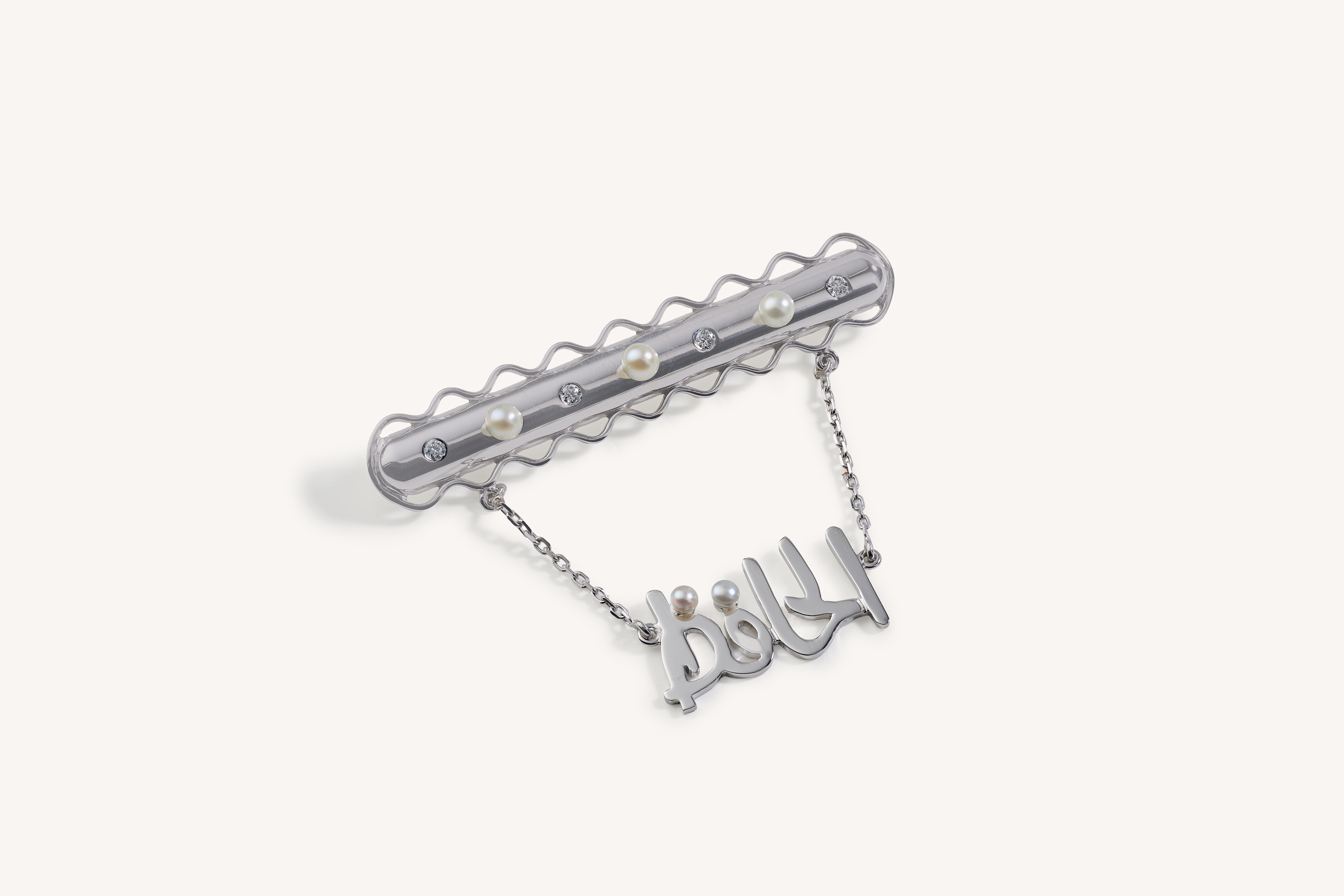 A brooch made of white gold, with ‘Al-Hafeth’ one of the names of god, dangling from the brooch.