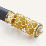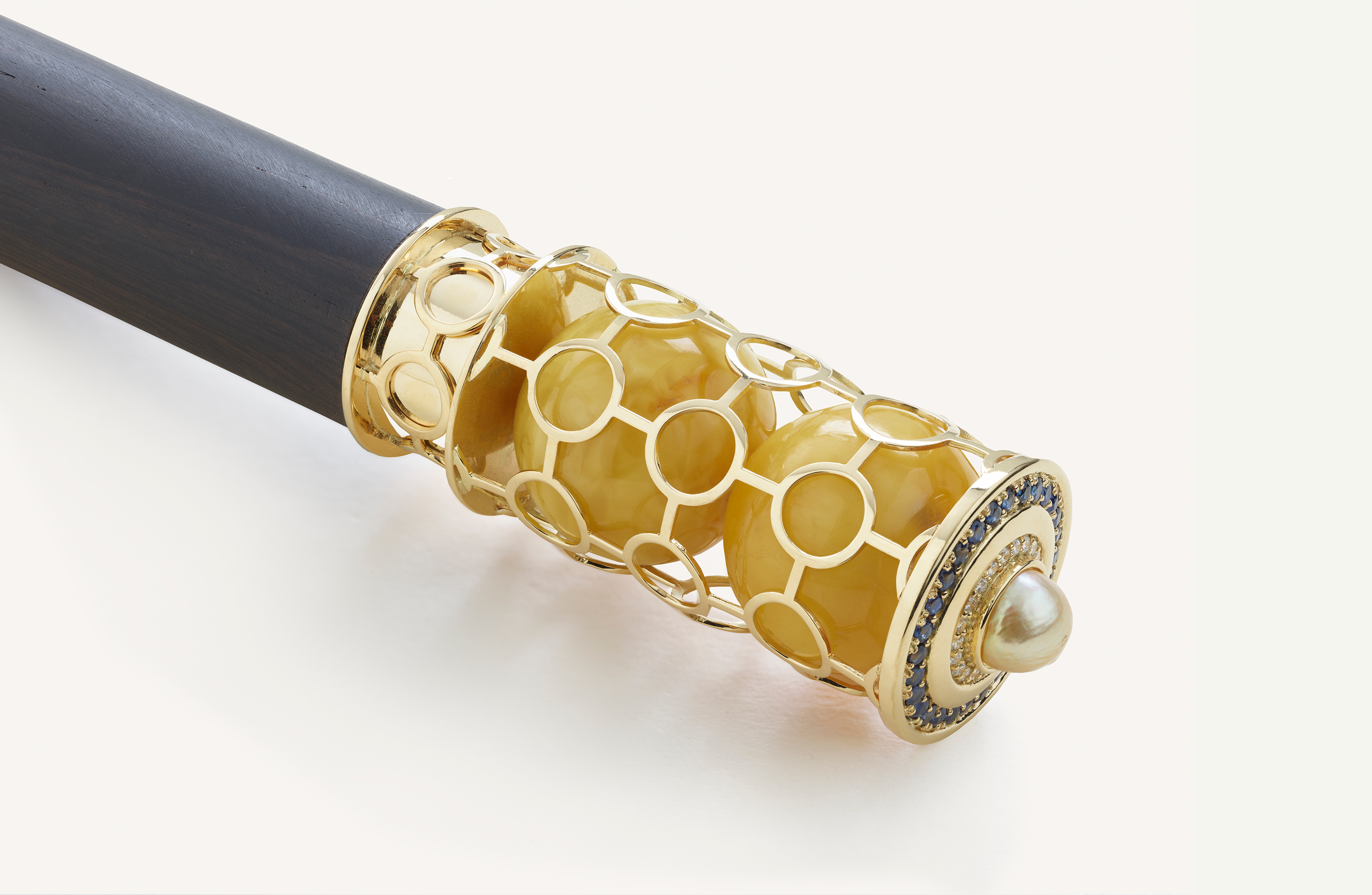 تم وضع كرتين كهرمانيتين ساحرتين بلون الشمس داخل قفص ذهبي أصفر رقيق. يثير التصميم الهندسي المعقد إحساسًا بالأناقة العصرية، في حين تضيف مجموعة مذهلة من الياقوت الأزرق والألماس اللامع بريقًا سماويًا. وتتوج هذه القطعة بلؤلؤة رائعة ولامعة، تحتفل بالجمال الطبيعي الذي يكمن في قلب كل إبداعات مطر.