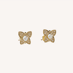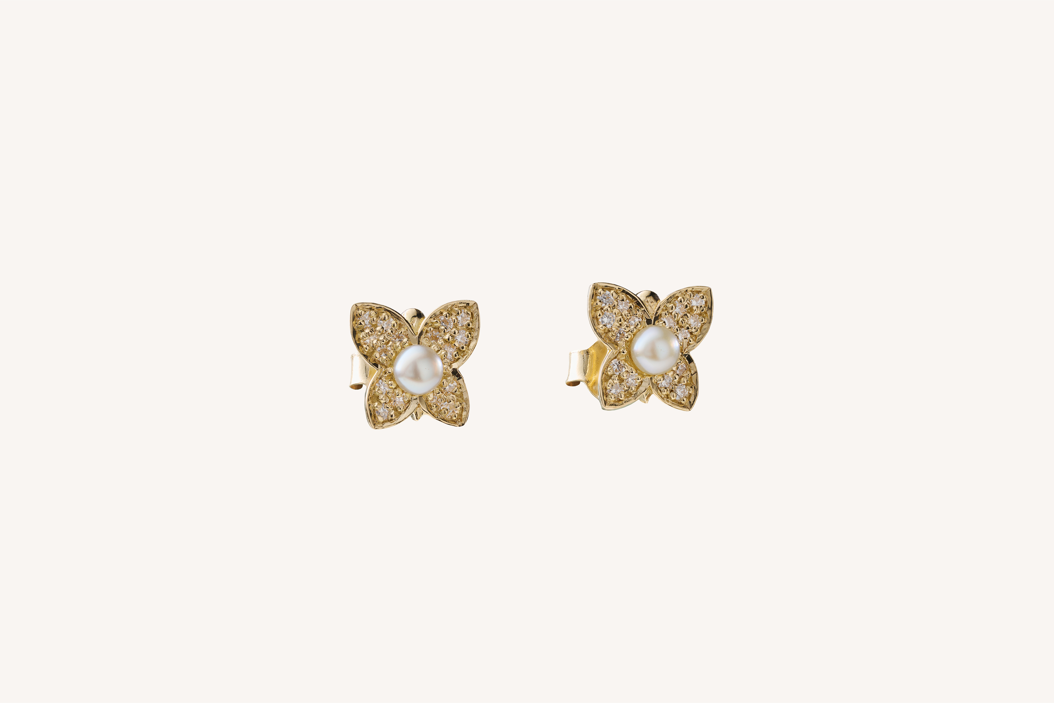 Butterfly earrings made of yellow gold, frosted with diamonds and featuring a pearl at the center.