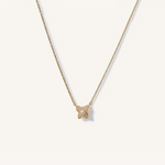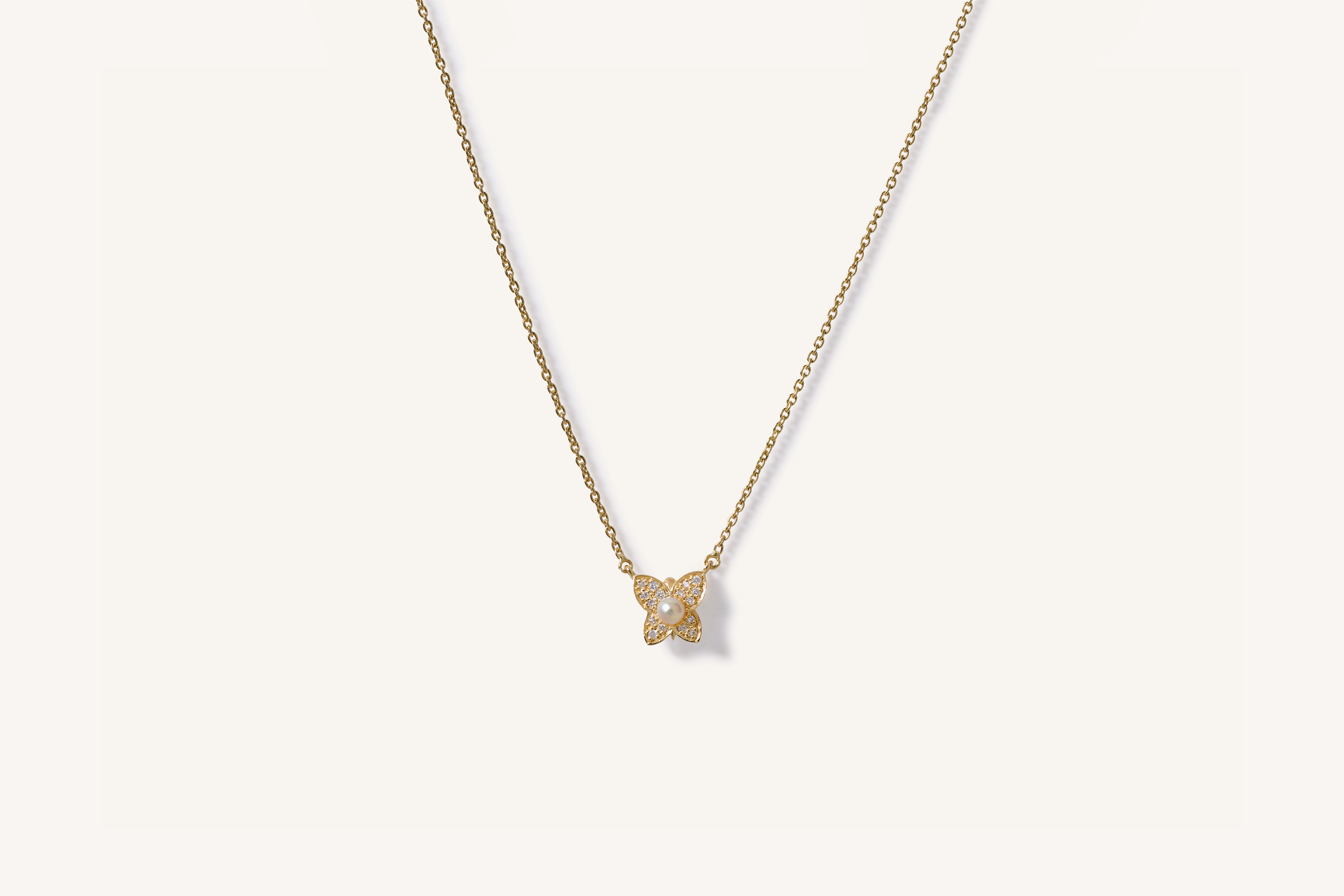 A butterfly pendant made of yellow gold, frosted with diamonds and featuring a pearl at the center, attached on a gold chain.