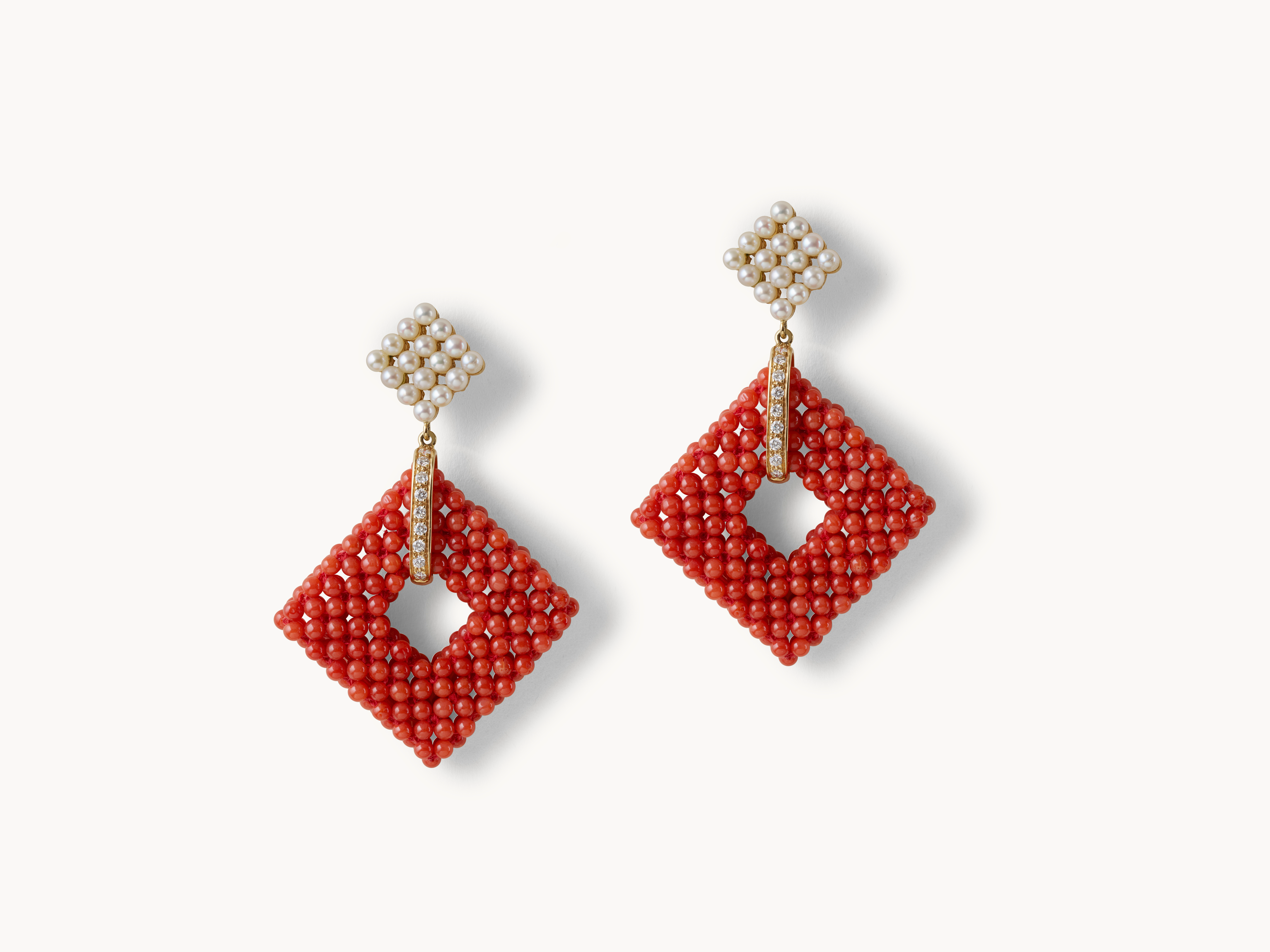 مزيج جريء من أرقى كنوز الطبيعة، تجمع هذه الأقراط بين اللؤلؤ والخرز المرجاني. تم ربط الخرز المرجاني معًا لتكوين شكل هندسي ثلاثي الأبعاد. يتم ربط اللؤلؤ والمرجان معًا بالذهب المرصع بالماس.