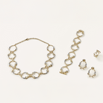 مجموعة المجوهرات هذه مزينة بـ 124 لؤلؤة لامعة، منسوجة بشكل معقد في تصميم من الذهب عيار 18 قيراط. صُنعت القلادة والسوار والأقراط والخاتم بعناية شديدة بالتفاصيل، وهي تمزج بين الأناقة الخالدة والرقي المعاصر. يتم وضع كل لؤلؤة بعناية داخل حلقات ذهبية لامعة، مما يخلق مزيجًا متناغمًا من السحر الكلاسيكي والفن الحديث.