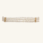 حبات من اللؤلؤ المطعج (الباروك) تنتشر بسلاسة على المعصم مفصولة بشريطين من الذهب الاصفر مرصعين بالألماس.