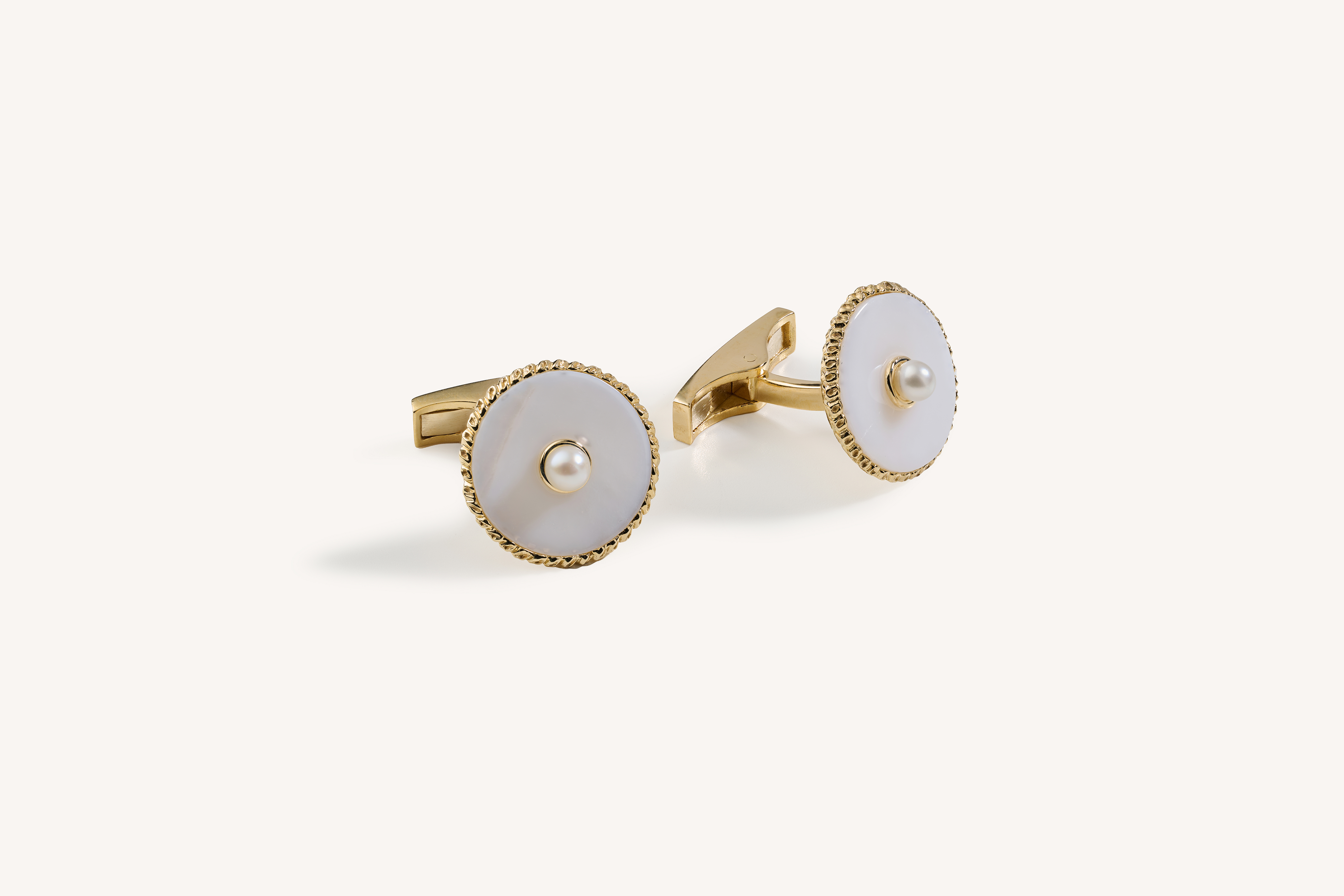 Crafted from yellow gold, this cufflink is a classic cufflink design. It features a round shaped mother of pearl with a button pearl in the center.