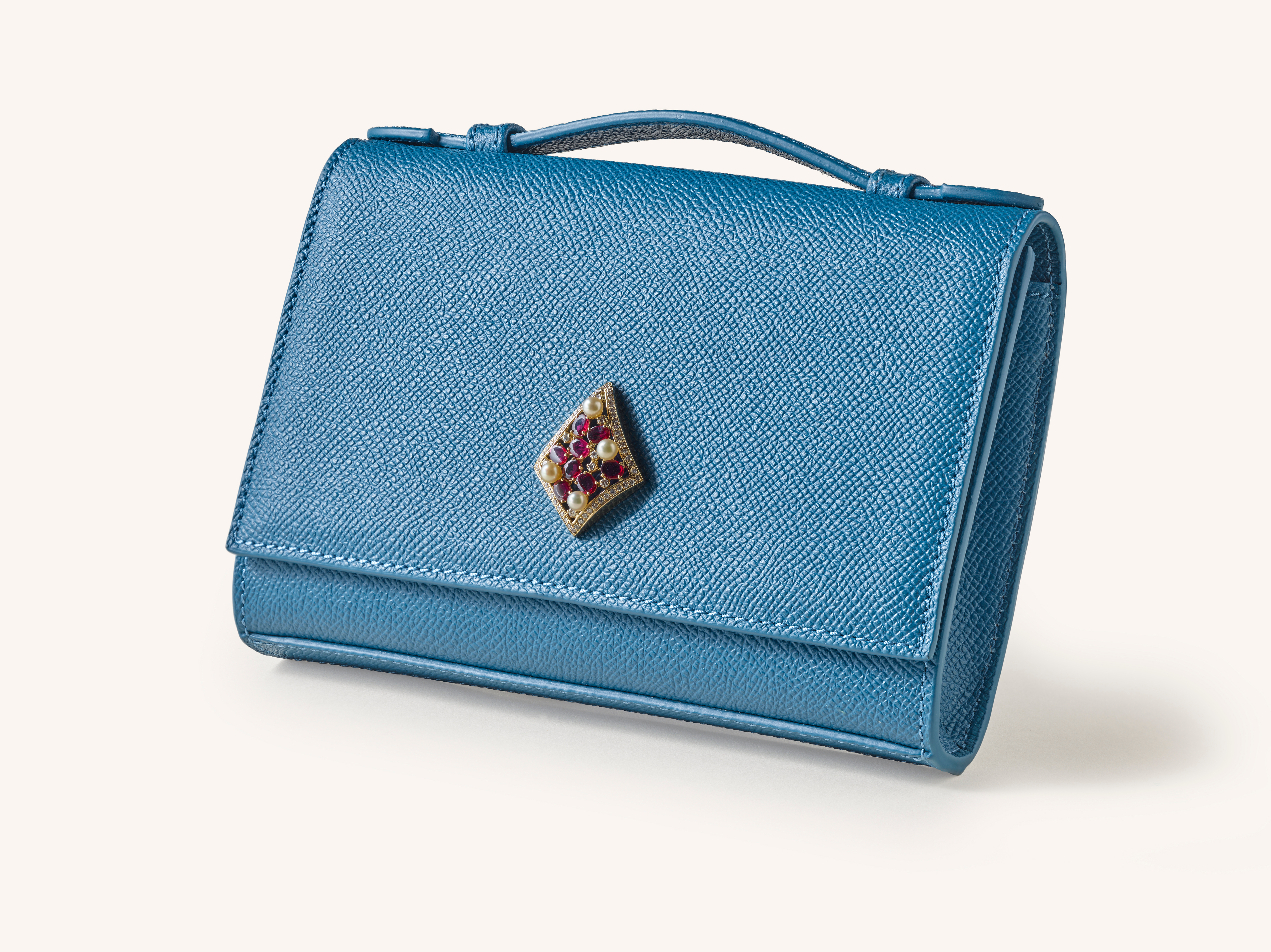 في قلب هذه الحقيبة توجد قطعة مركزية مذهلة من الياقوت، محاطة بالذهب الأصفر، ومزينة بالألماس وأربع لآلئ طبيعية مضيئة. القطعة المركزية قابلة للفصل ويمكن ارتداؤها كبروش. إبداع تجتمع فيه الندرة والصقل.