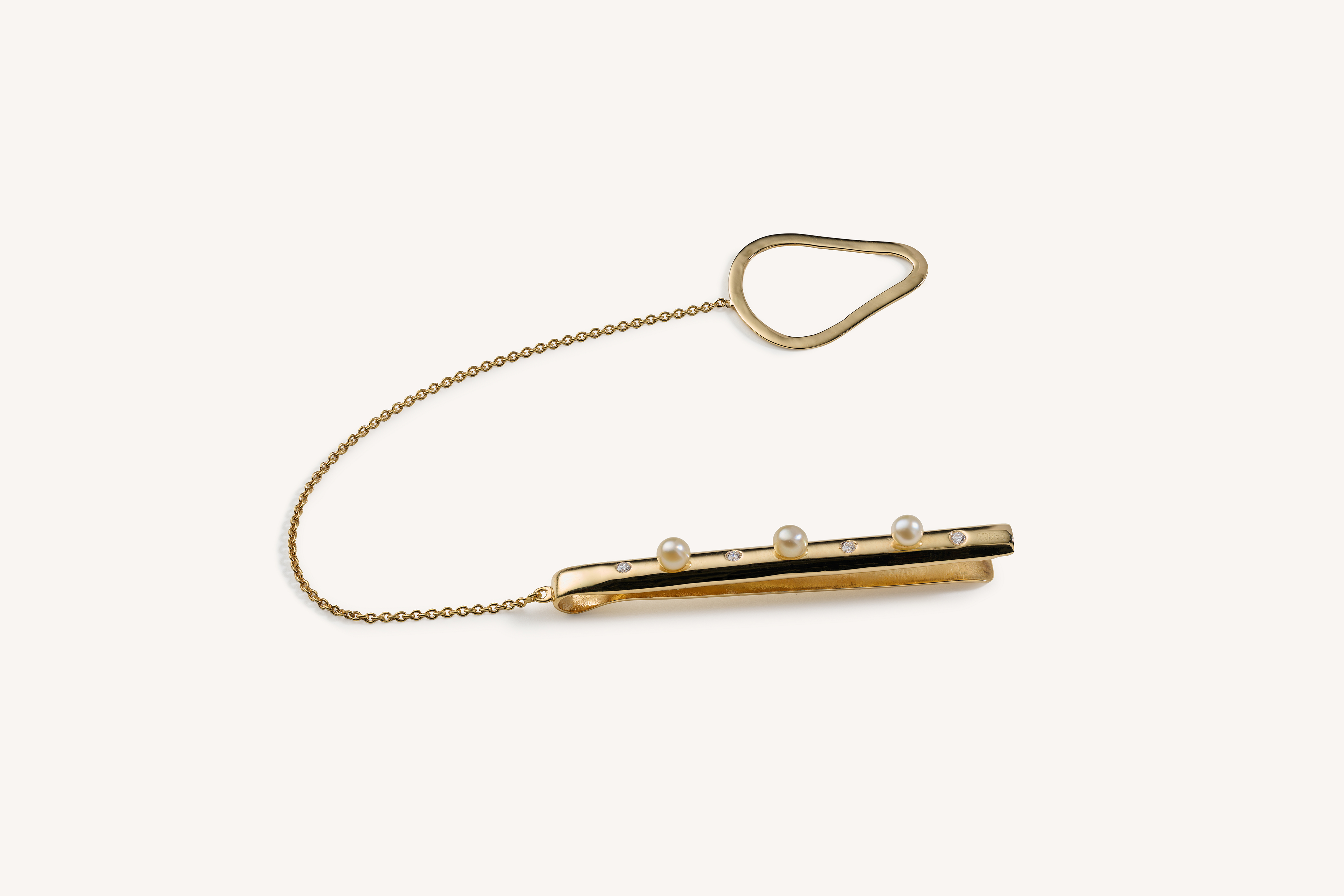 An Elegant yellow gold tie pin that features button pearls and diamonds, adding a stylish crowning accessory designed to catch the eye.