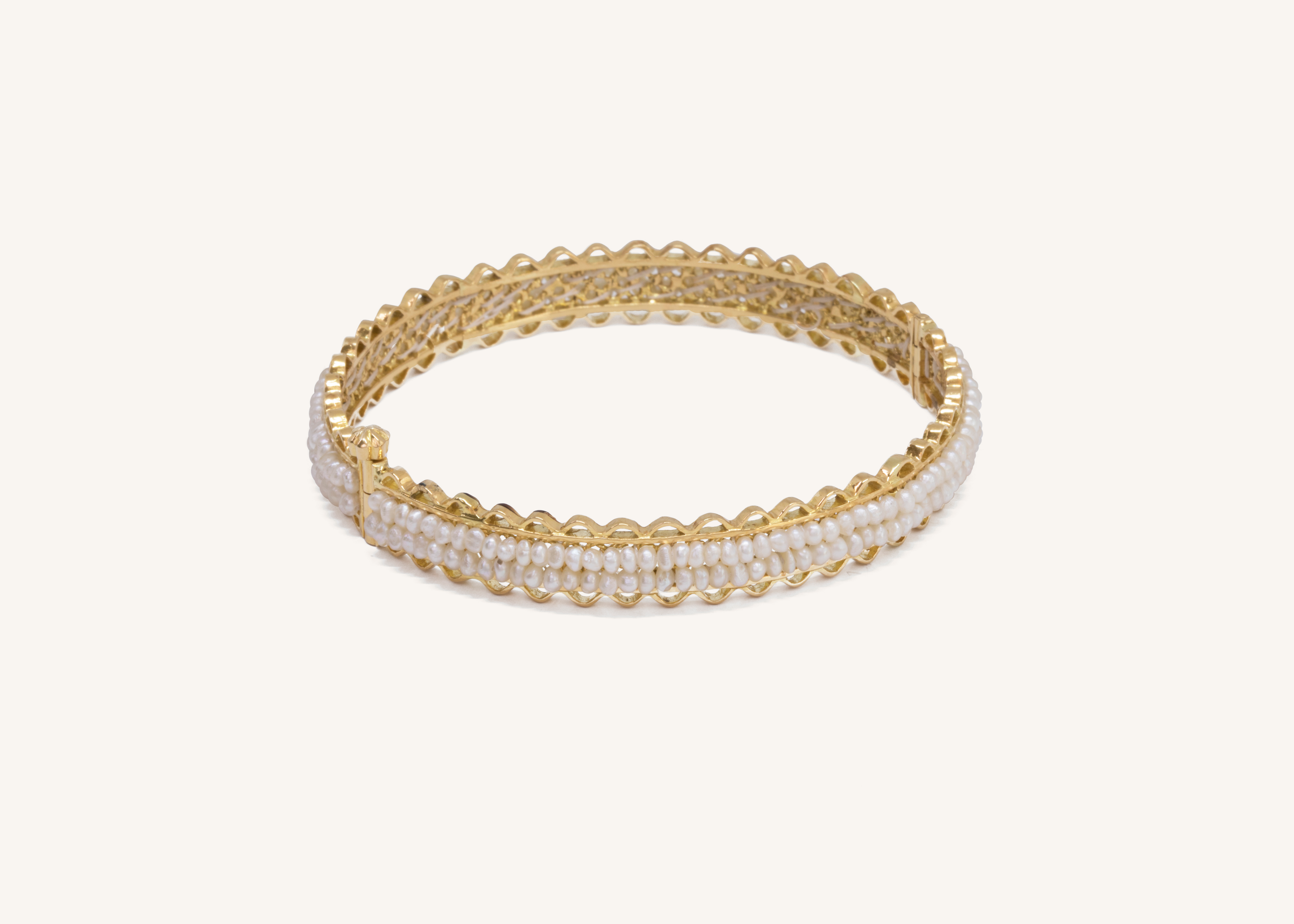 مستوحاة من الاساور التقليدية، صفين من اللؤلؤ الطبيعي المثبتة على إسوار من الذهب.