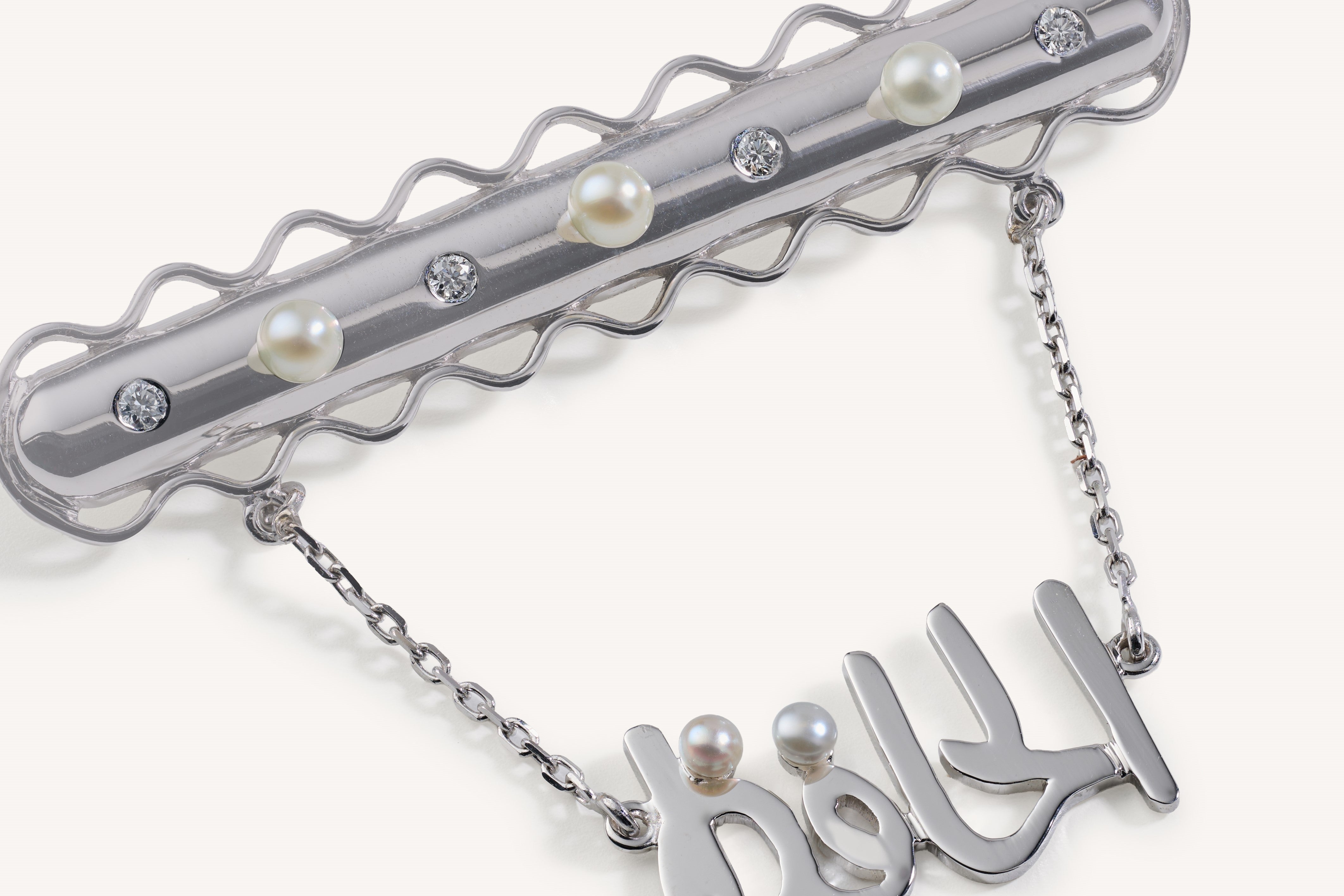 A brooch made of white gold, with ‘Al-Hafeth’ one of the names of god, dangling from the brooch.