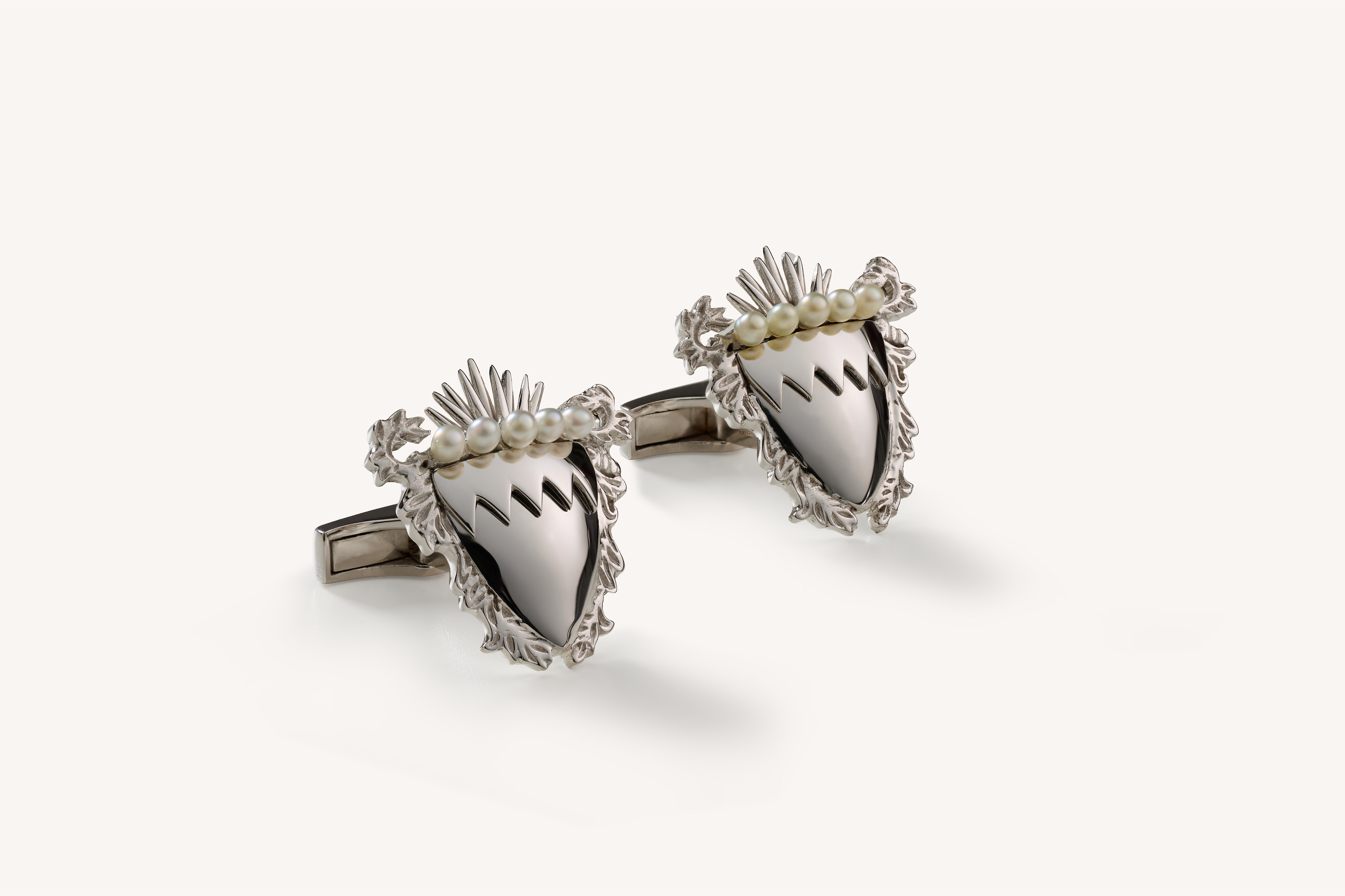This extraordinary cufflink is an homage to Bahrain's profound heritage, crafted in the iconic form of Bahrain's Royal Emblem. Crafted using white gold and features five pearls on each cufflink.