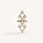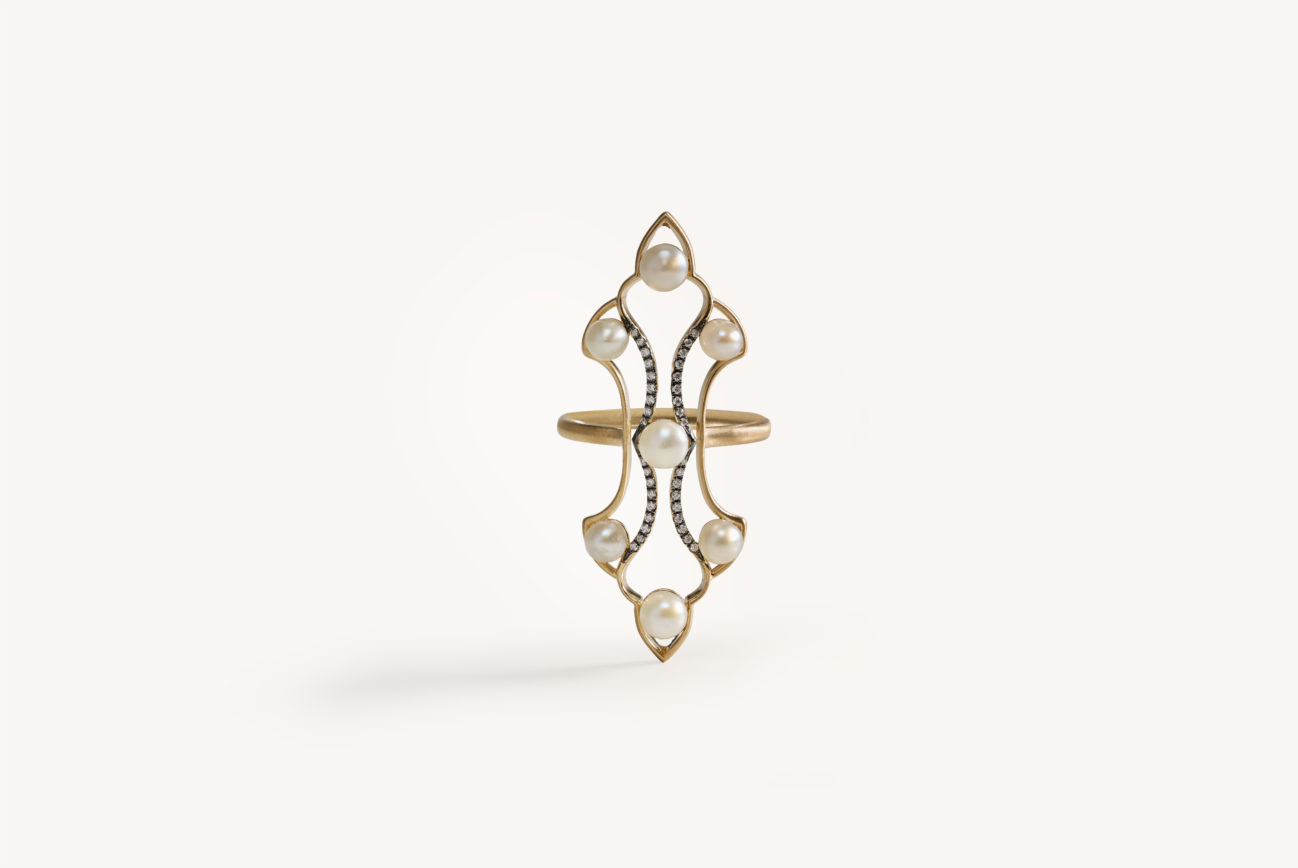 The Black Rhodium set is sculpted using a blend of high polish gold and brush gold creating a warm foundation that is accentuated through black rhodium and diamonds which intensifies the structure of their design while allowing the luster of the pearls to shine.