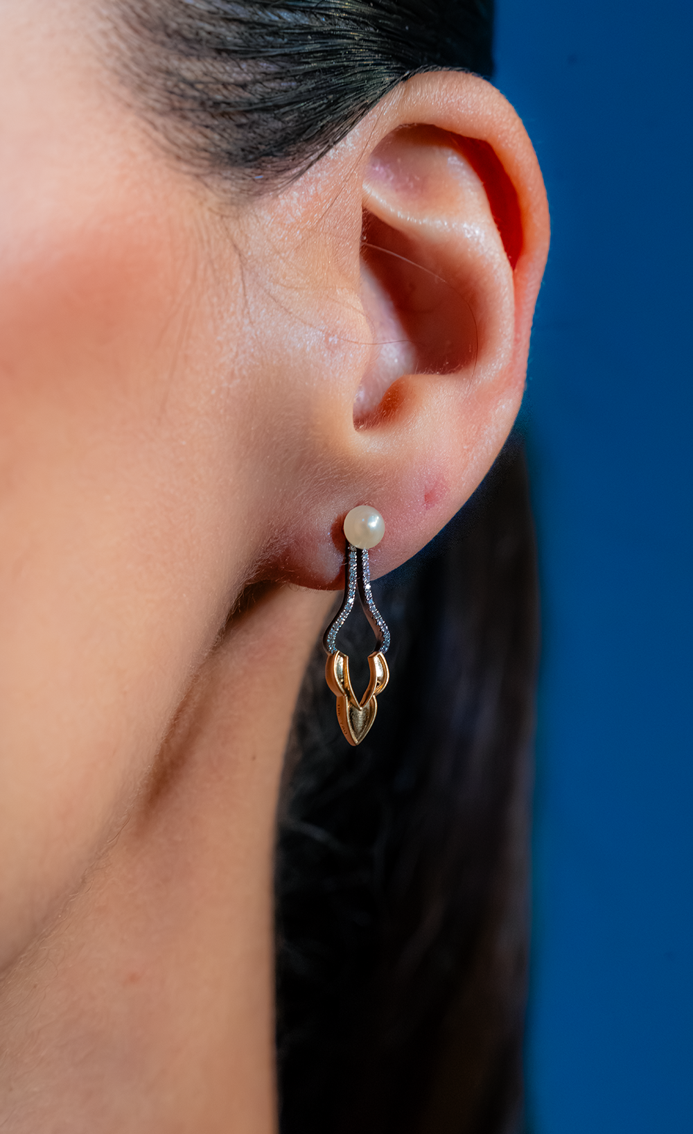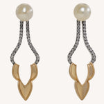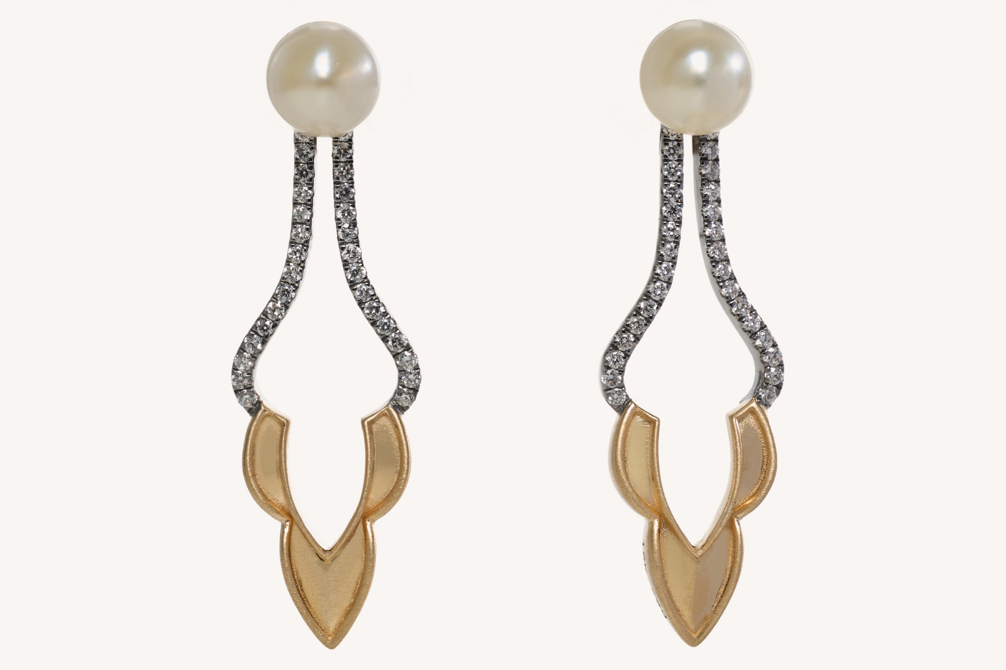 The Black Rhodium Whisper set is sculpted using a blend of high polish gold and brush gold creating a warm foundation that is accentuated through black rhodium and Diamonds which intensifies the structure of their design while allowing the luster of the pearls to shine.