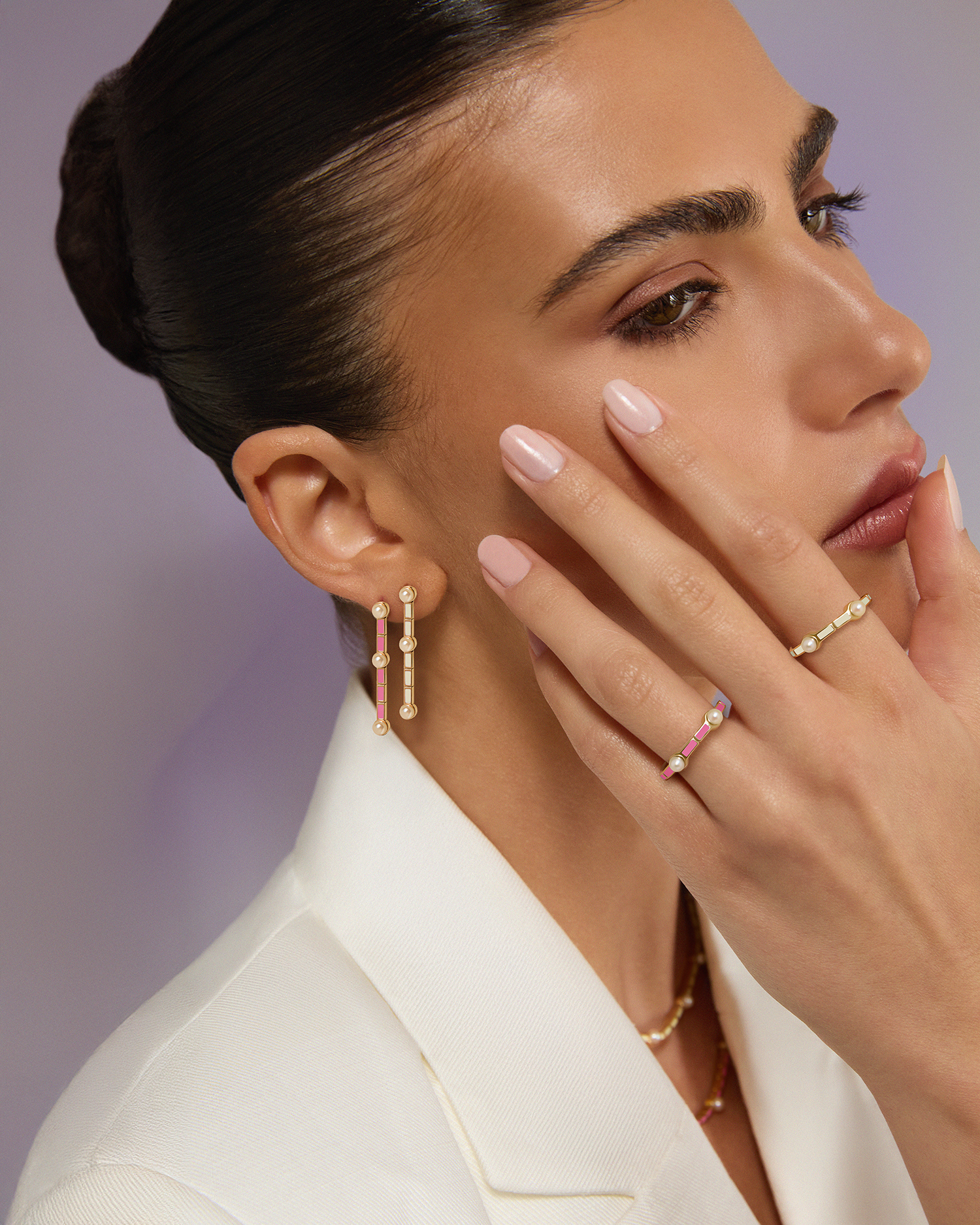 Inspired by the classic tennis silhouette, the Aurora Collection reinterprets it through hand-applied enamel in luminous shades of sunlit yellow, lilac and blush pink. Crafted in gold and accented with carefully selected natural pearls, each piece reflects the quiet brilliance of nature’s own Aurora light display. Designed to layer effortlessly, the rings, bracelets, necklaces and earrings move fluidly together.
