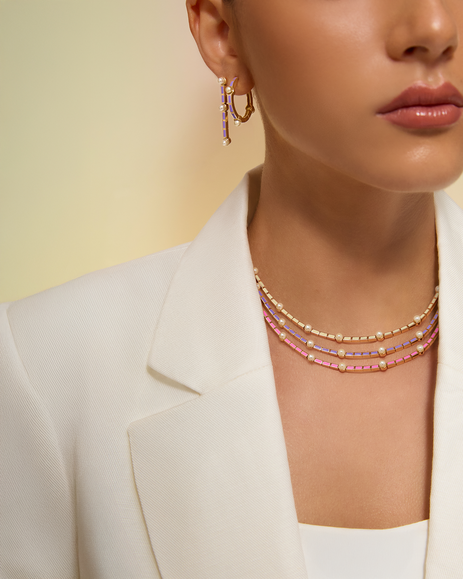Inspired by the classic tennis silhouette, the Aurora Collection reinterprets it through hand-applied enamel in luminous shades of sunlit yellow, lilac and blush pink. Crafted in gold and accented with carefully selected natural pearls, each piece reflects the quiet brilliance of nature’s own Aurora light display. Designed to layer effortlessly, the rings, bracelets, necklaces and earrings move fluidly together.