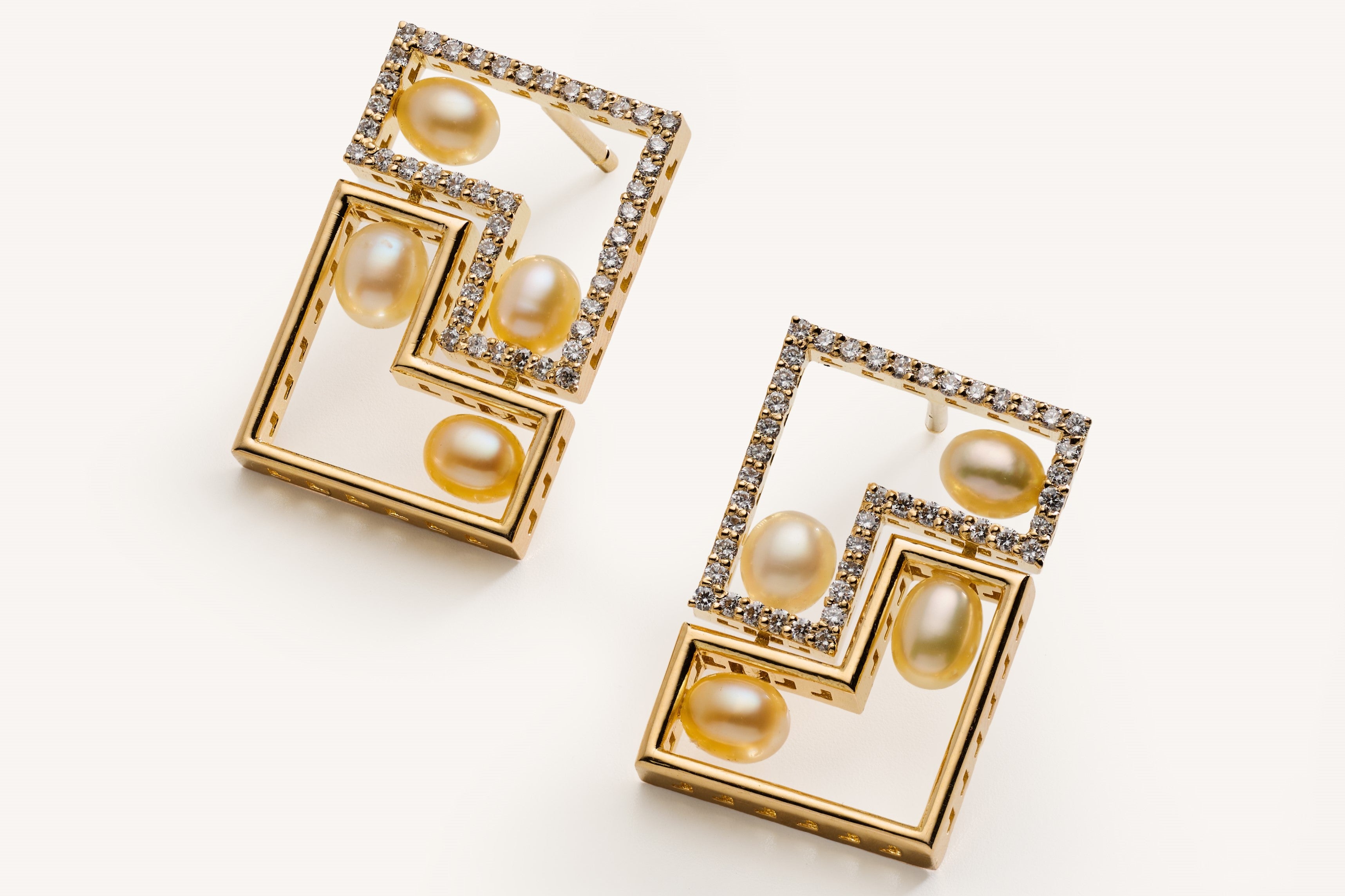 The Geometric set is where architectural precision meets precious warmth. Each piece is composed of yellow gold, with angles of the pieces being illuminated by fine Diamonds, creating a luminous harmony with the pearls, that were chosen for the rich cream and golden undertones of their hues.