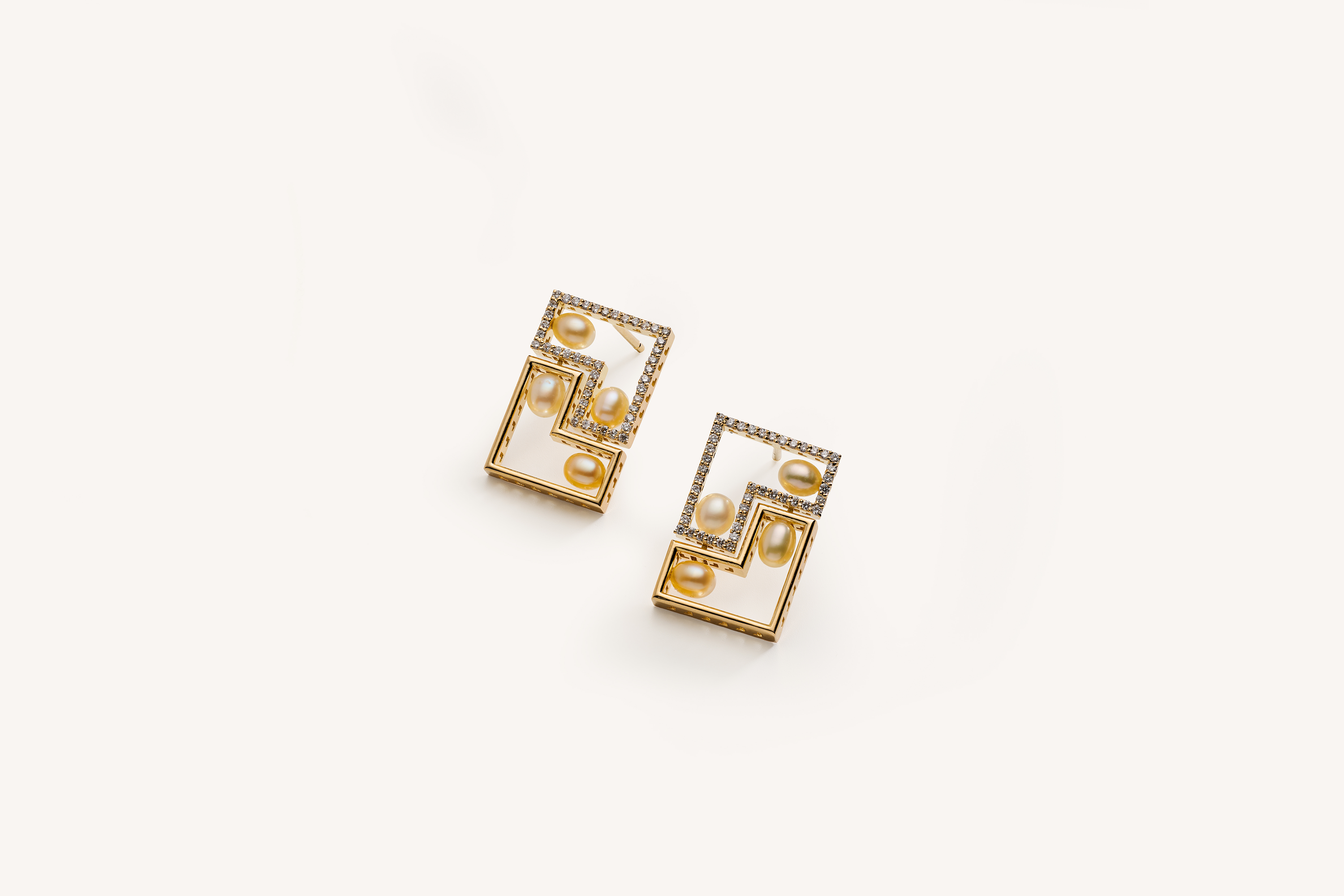 The Geometric set is where architectural precision meets precious warmth. Each piece is composed of yellow gold, with angles of the pieces being illuminated by fine diamonds, creating a luminous harmony with the pearls, that were chosen for the rich cream and golden undertones of their hues.