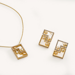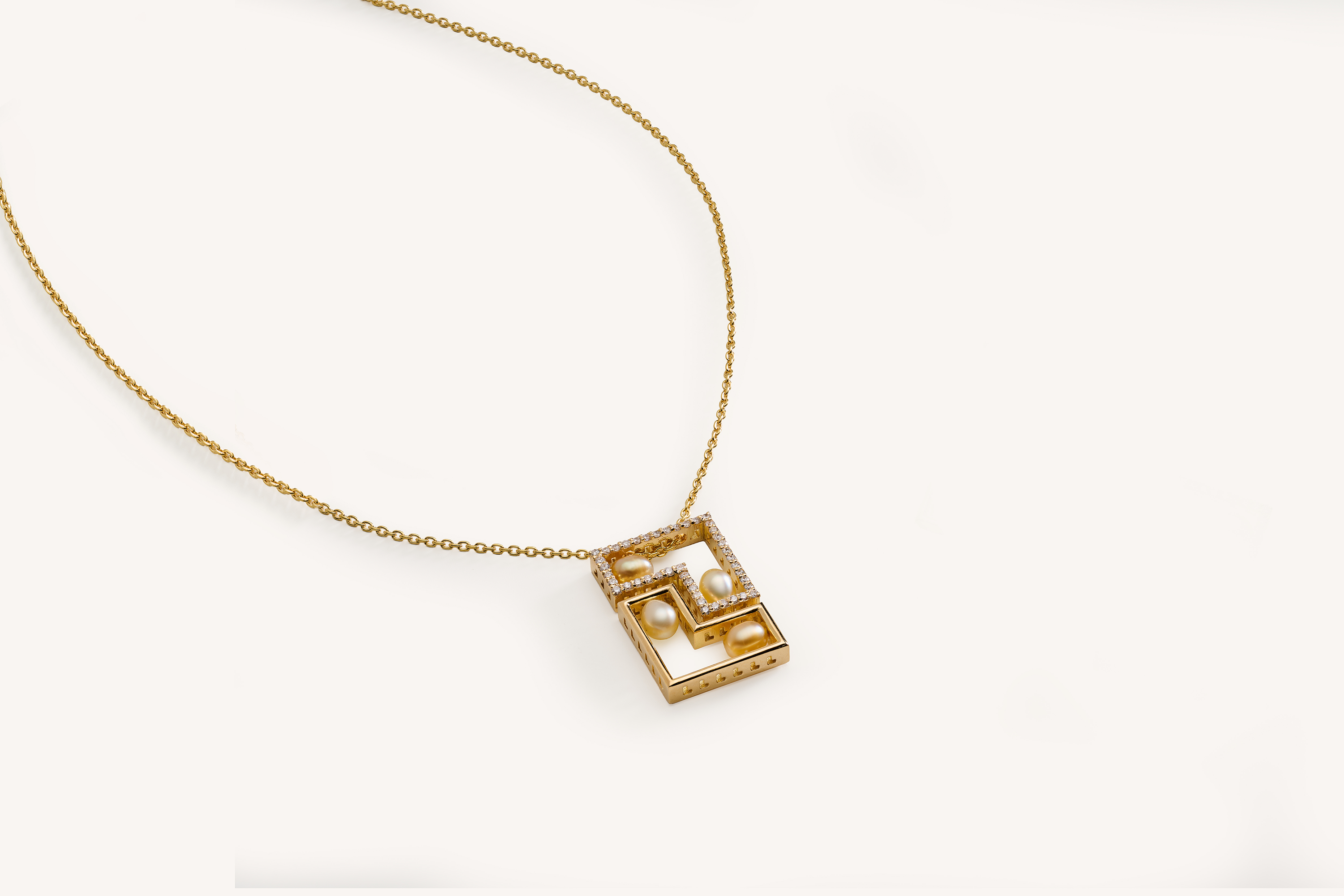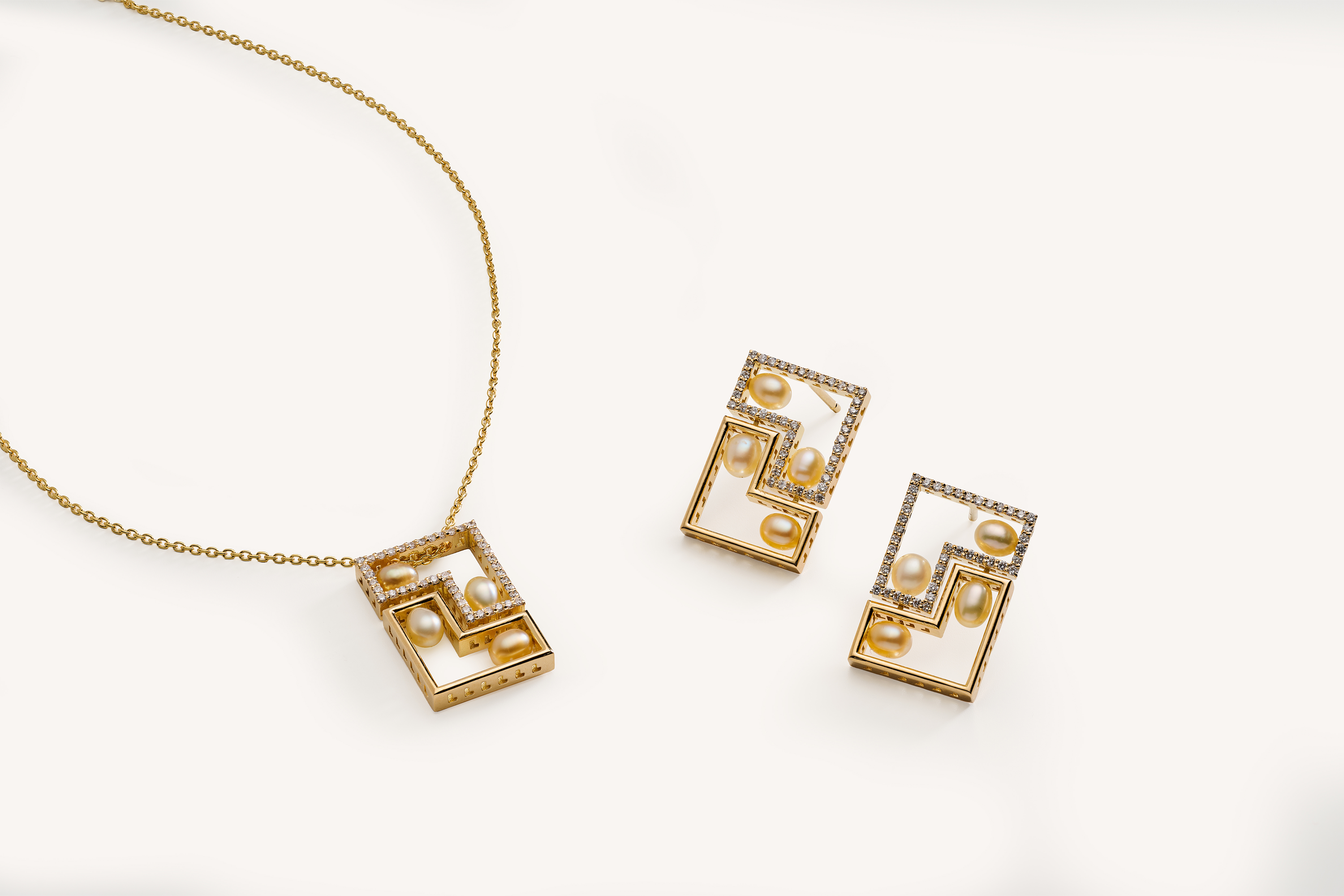 The Geometric set is where architectural precision meets precious warmth. Each piece is composed of yellow gold, with angles of the pieces being illuminated by fine diamonds, creating a luminous harmony with the pearls, that were chosen for the rich cream and golden undertones of their hues.