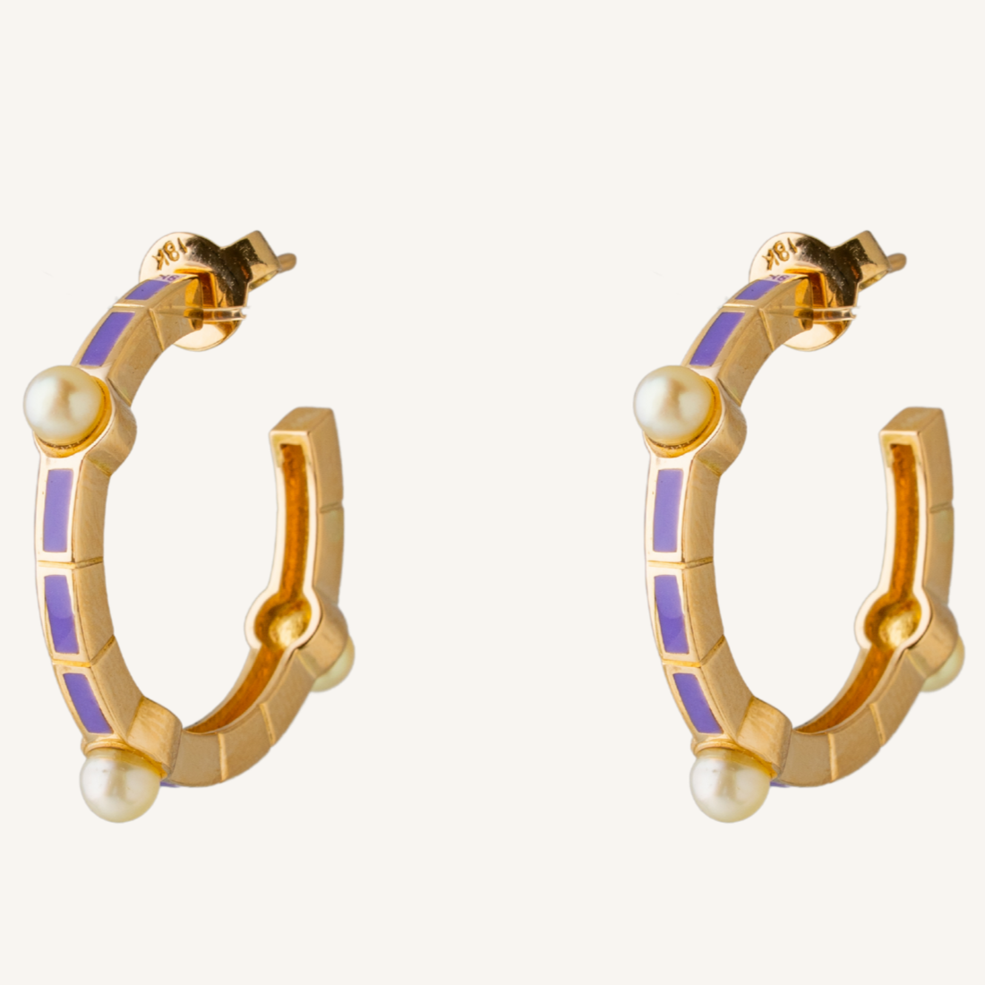 Inspired by the classic tennis silhouette, the Aurora Collection reinterprets it through hand-applied enamel in luminous shades of sunlit yellow, lilac and blush pink. Crafted in gold and accented with carefully selected natural pearls, each piece reflects the quiet brilliance of nature’s own Aurora light display. Designed to layer effortlessly, the rings, bracelets, necklaces and earrings move fluidly together.