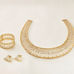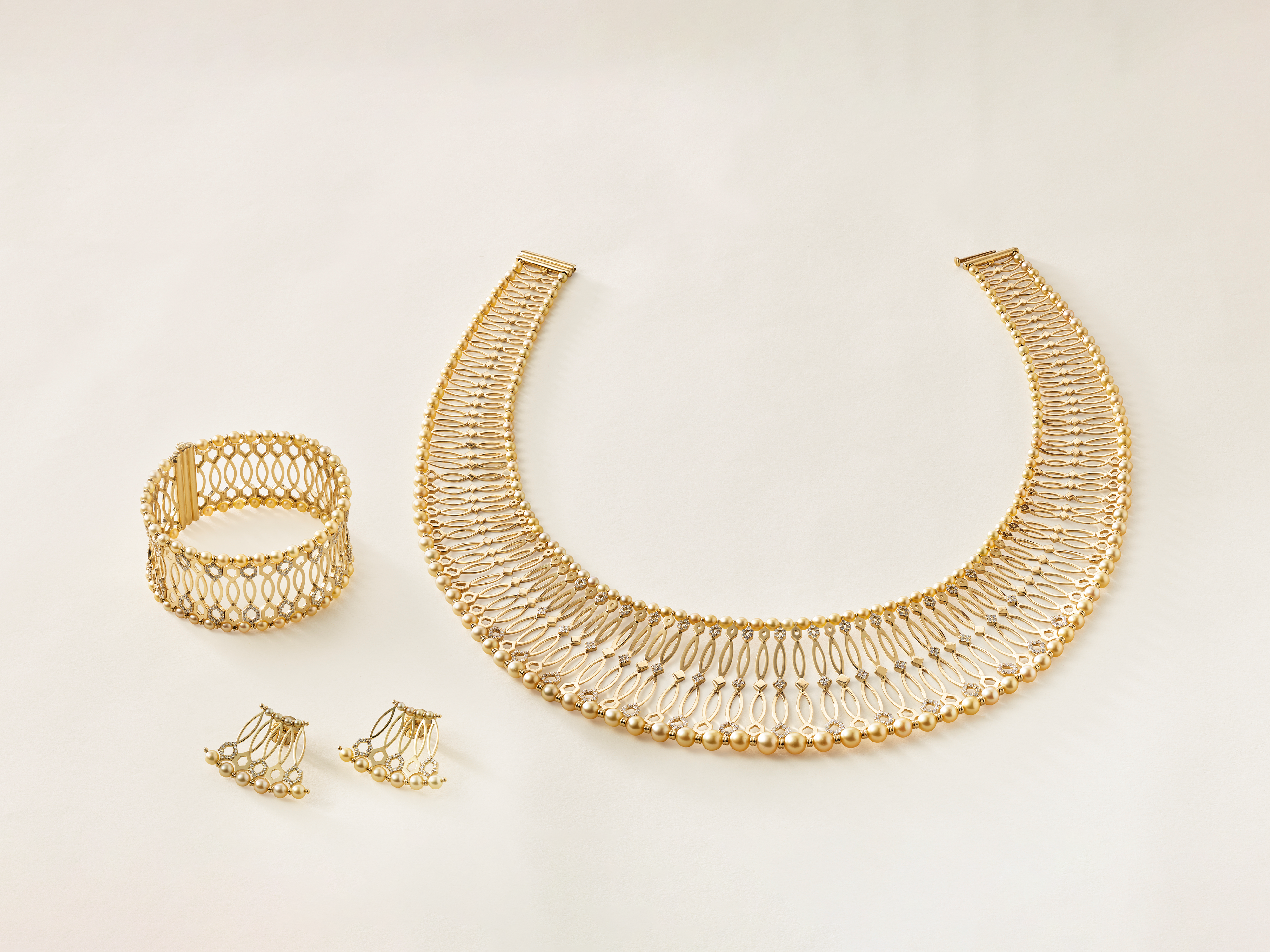 A celebration of cultural tradition and unparalleled craftsmanship. Inspired by the ceremonial necklaces worn by the Maasai tribe, this masterpiece features one hundred and ninety-six round Jiwan pearls that are a soft cream color with golden undertones, framed in a flexible gold structure that is touched with the finest diamonds.