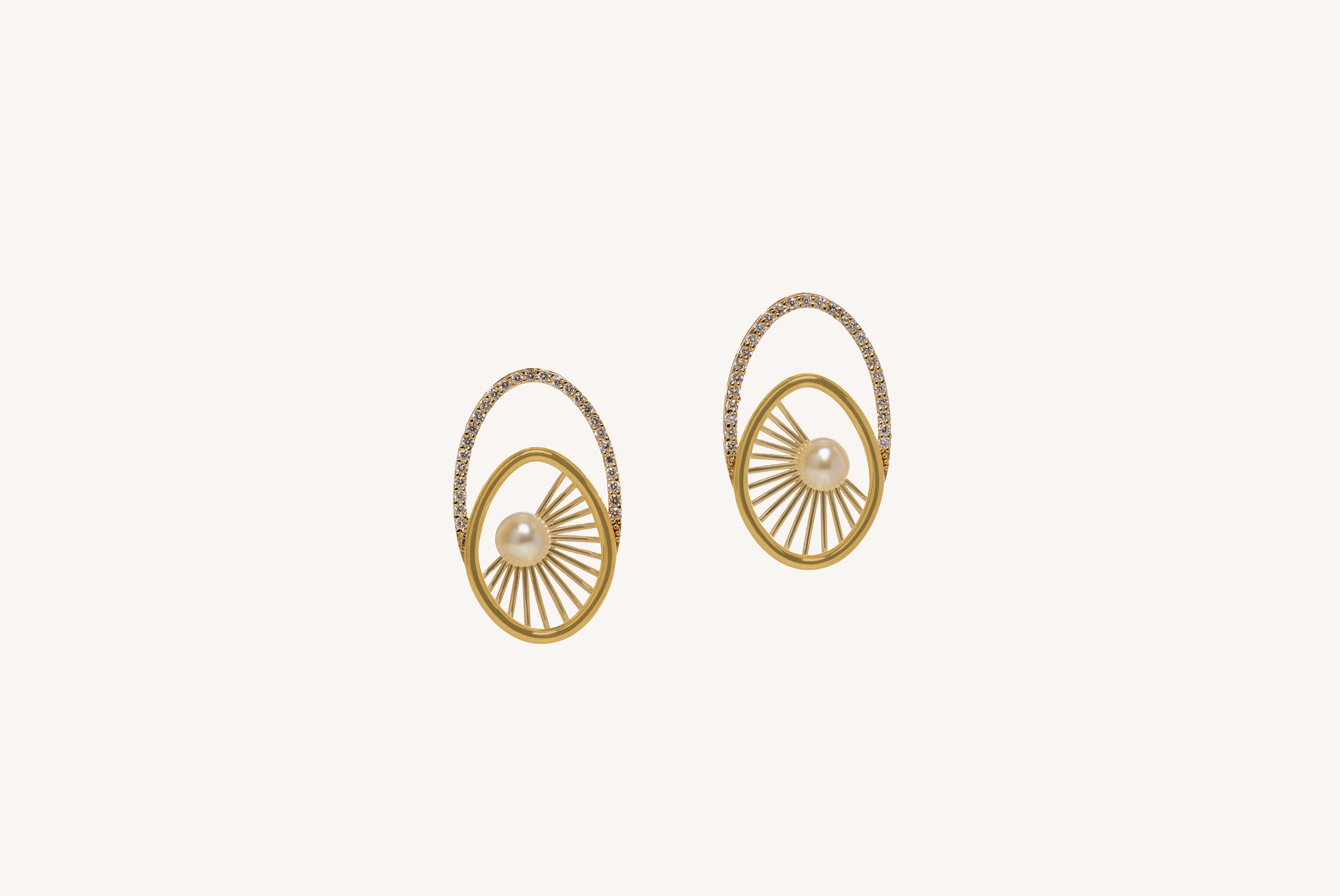 The Rays of Sun Collection is sculpted in yellow gold, the design features a striking diamond-set halo that houses an inner circle of fine gold rays. This precise and radiating structure focuses all attention on the smooth, lustrous pearl at its core.