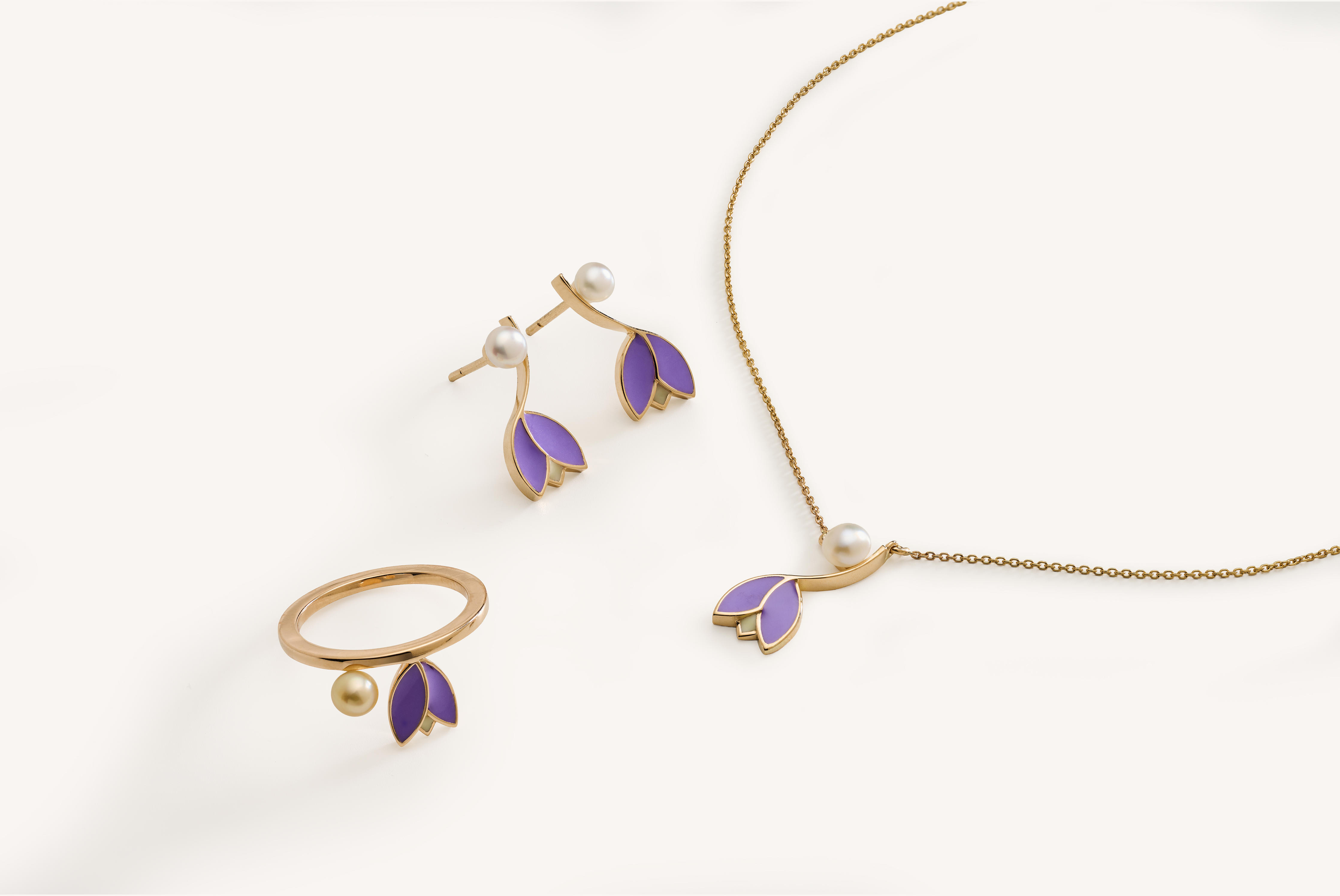 The Tulips Collection is a radiant fusion of nature and artistry. Each piece is meticulously crafted in warm yellow gold and brought to life with finely applied enamel work, creating the vibrant colors of a spring bloom, complementing the delicate luster of the pearls.