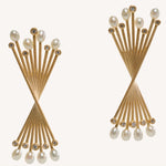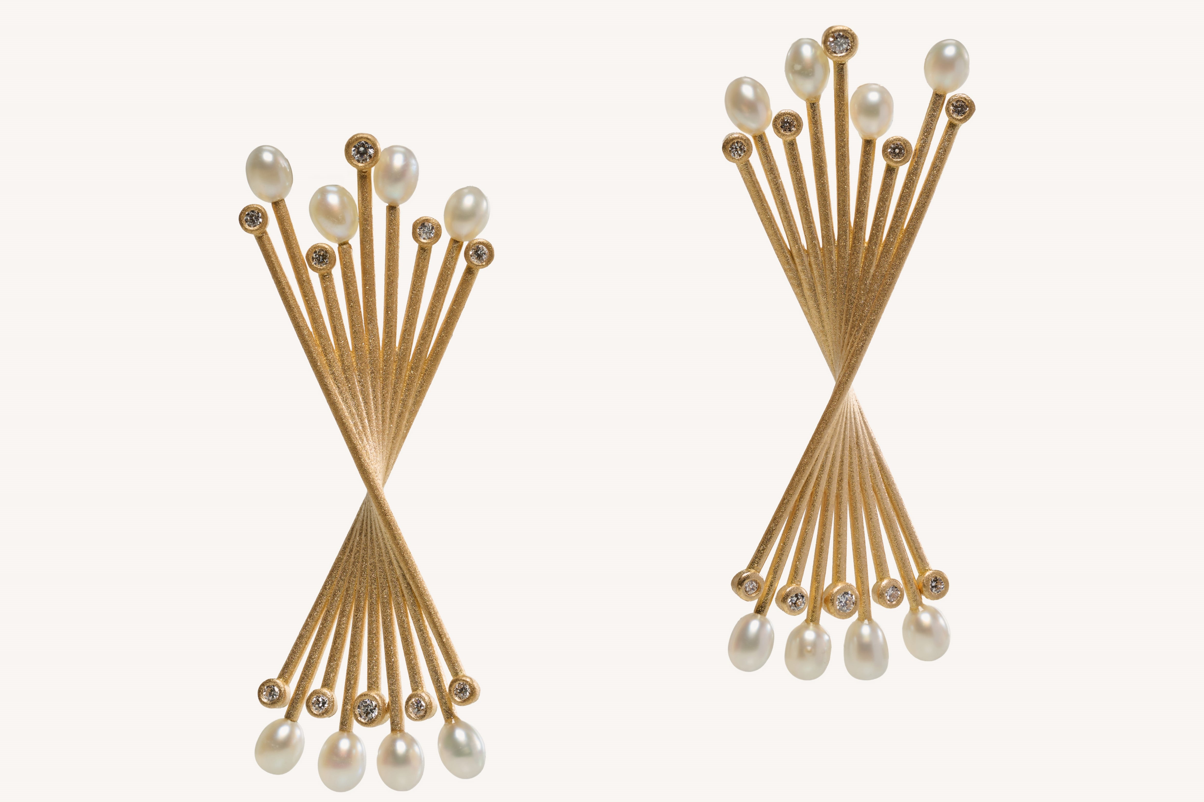 The Rotating spikes set captures movement and light in precious metal. Each piece features spikes of gold that twist elegantly at the center before radiating outward. The tips of these spikes being accentuated by pearls and Diamonds to give the set a complementary warm glow.