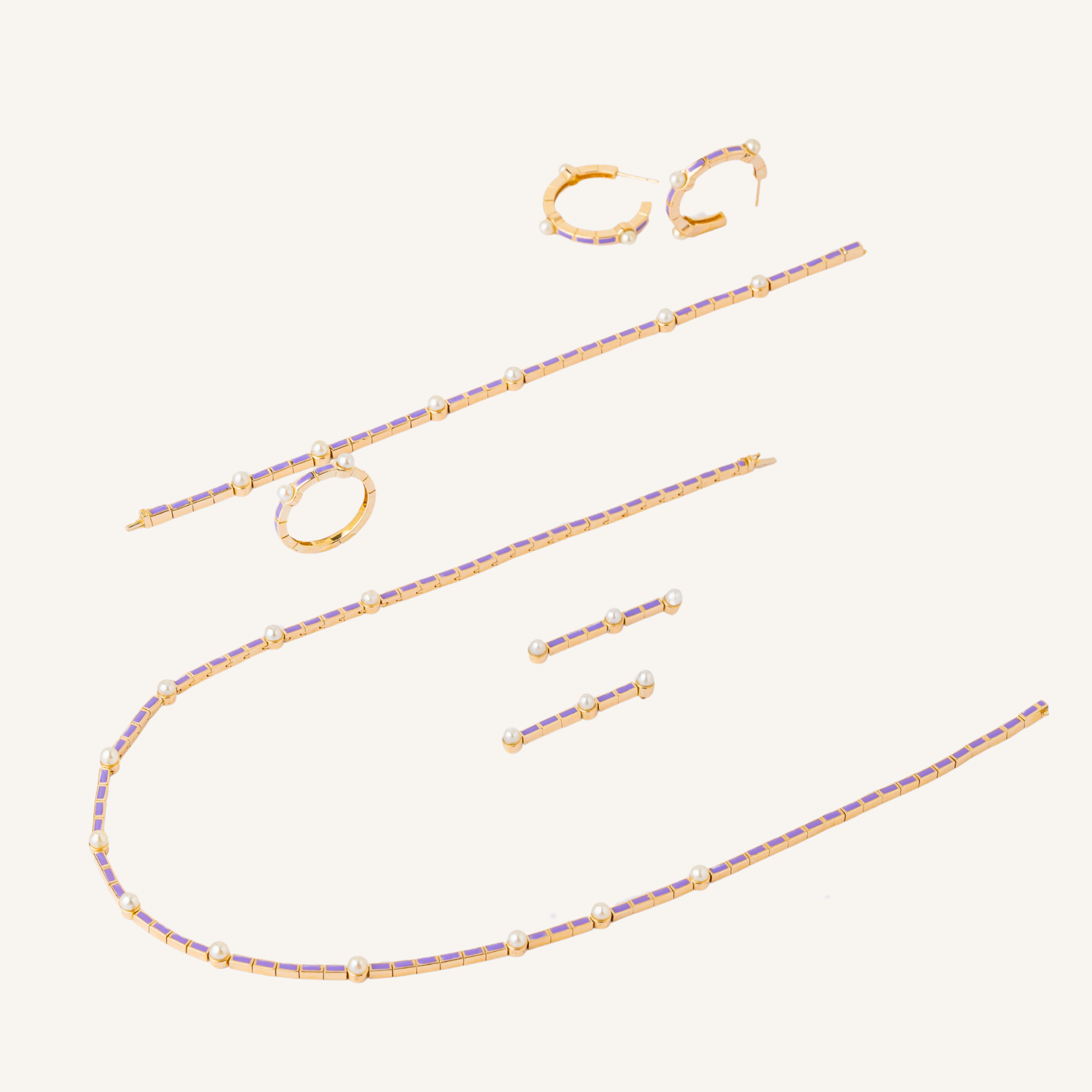 Inspired by the classic tennis bracelet, our Aurora collection offers a contemporary take with hand-applied enamel in luminous shades; sunlit yellow, lilac purple and blush pink. Each piece is crafted in gold and accented with hand-selected natural pearls.